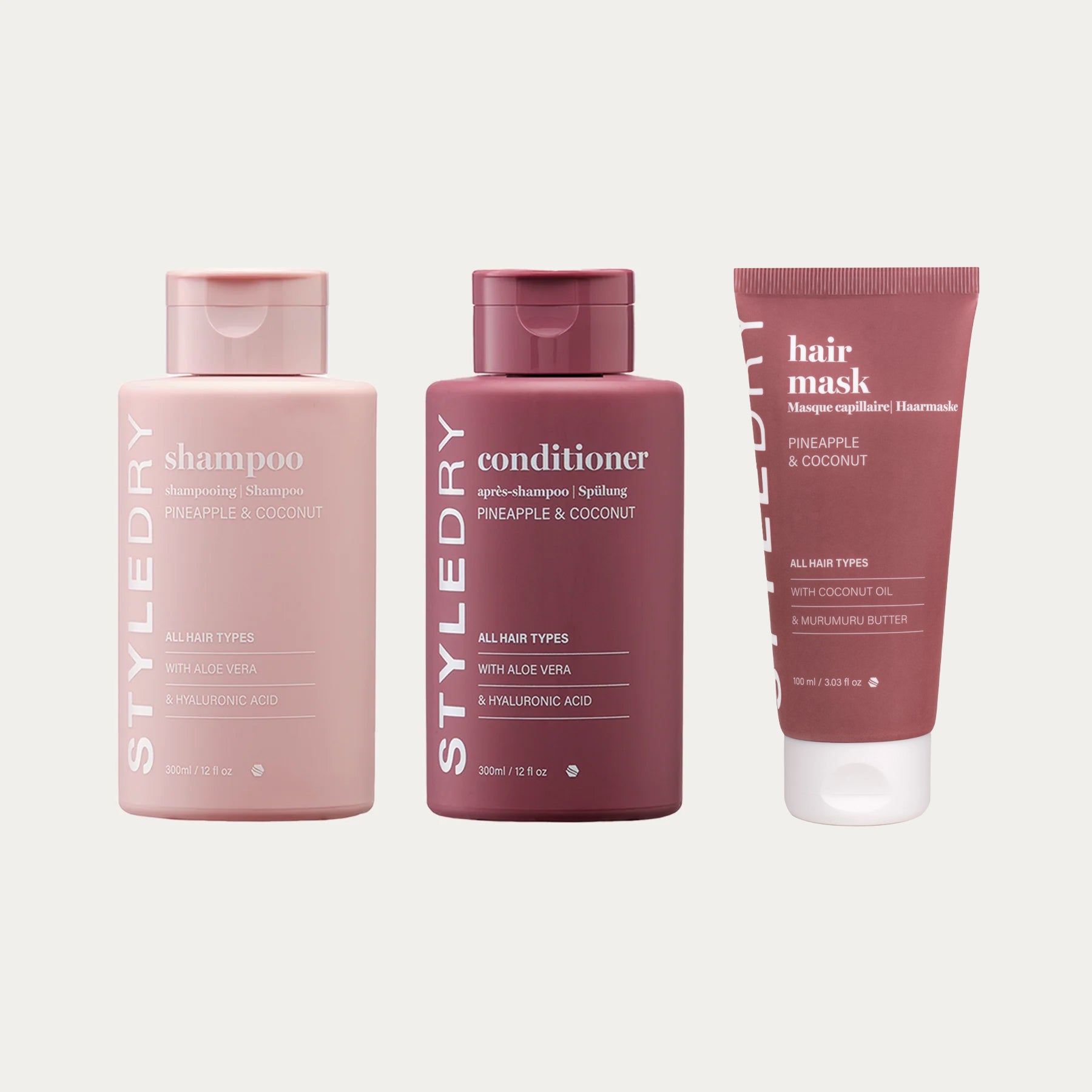 The STYLDRY shampoo and conditioner collection is the perfect solution for anyone seeking gentle yet effective hair care without sulfates or parabens. Our nourishing formulas thoroughly cleanse your hair, removing excess oil and product buildup, while providing softness, hydration, and long-lasting freshness.